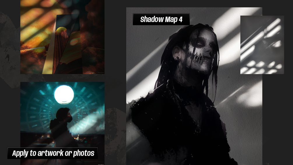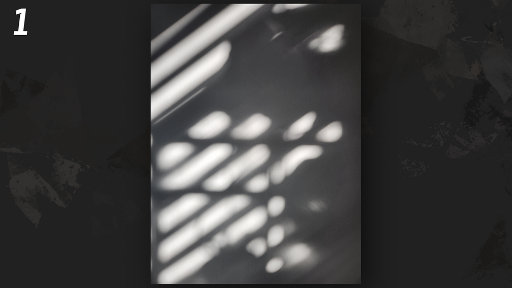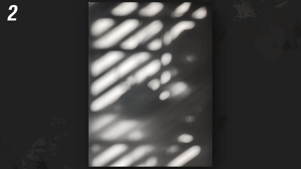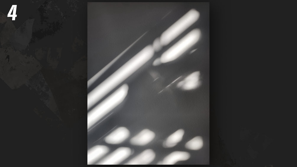 (4) Free unique shadow overlays, cast on a real soft painted drywall background. Grayscale images are included for easy overlay, pre-Gaussian blurred. Not AI-generated or AI-manipulated.